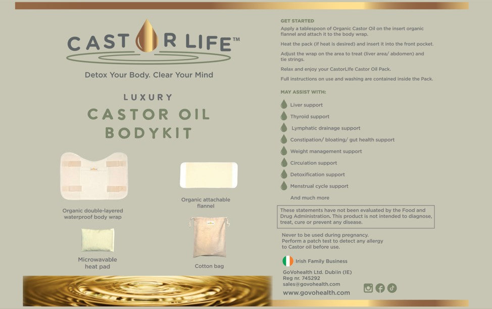 please note that the castor Oil is NOT included;  to maintain your wrap chemical free please source an organic castor oil  ( we have it in stock )